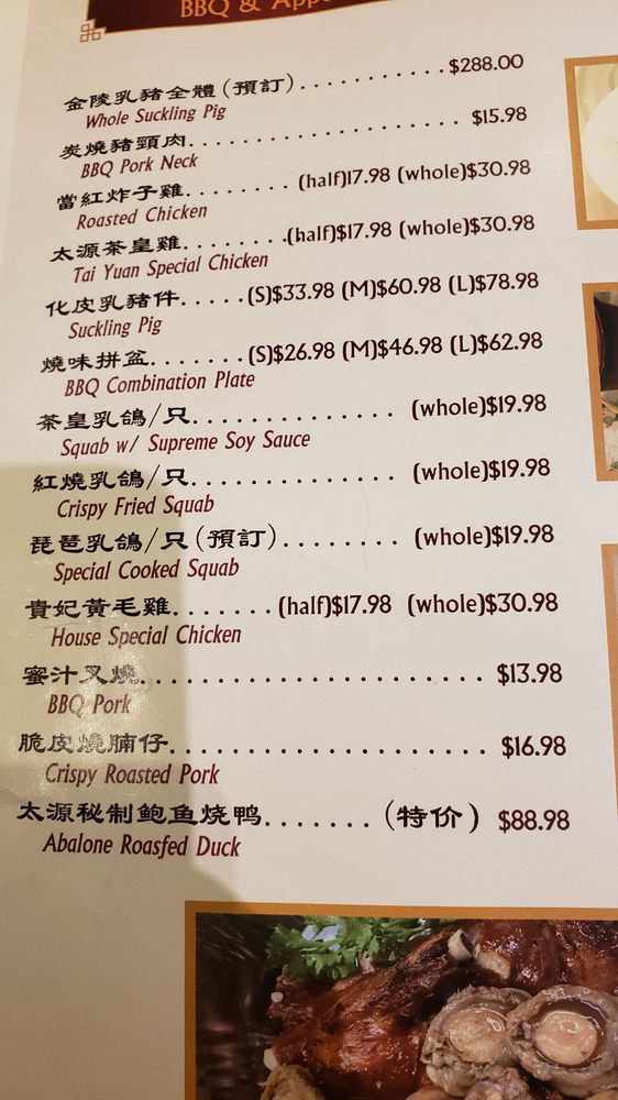 Welcome to Tai Yuan Seafood Restaurant, a haven for seafood lovers nestled in Daly City, CA. This vibrant eatery features a diverse menu that celebrates fresh and flavorful seafood dishes, making it perfect for brunch, lunch, or dinner. One standout is the Braised Sea Cucumber, a delicacy that highlights the restaurant's commitment to quality ingredients. Another must-try is the Crispy Chicken, renowned for its enticing crunch and succulent meat.
